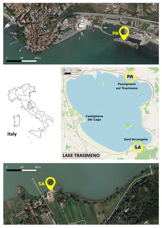 Lake Trasimeno is a laminar lake located in the Umbria Region (Central Italy). It is the fourth-largest lake in Italy; it has an extension of 124 km2 and a maximum depth of 6.3 m. For a detailed description of the study area and the benthic community of this environment, see [28,29,30].