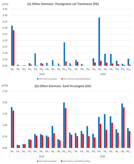 In the years 2019–2020, because of the limited material collected (21.84 g), the analysis of the other biomass showed that, at the site PA, the identification of the taxa was only 31.25% (6.82 g) (Figure 2a). By contrast, at the site SA, the situation was completely different. Indeed, here, the identification of the taxa belonging to the other biomass reached 80.47% (236.20 g), with a low and homogeneous deviation from the whole amount of the other biomass found in the various samples (Figure 2b).