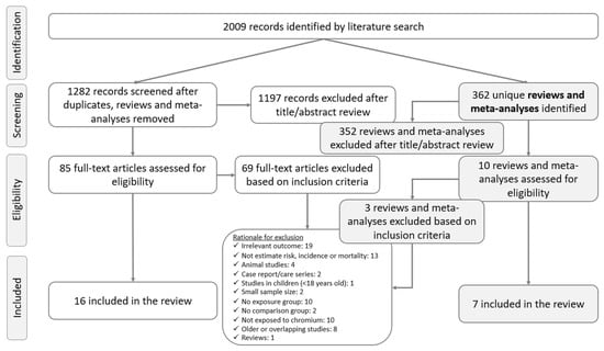 The literature yielded 2009 records (Figure 1). After removing the duplicates, we obtained 1282 research papers and 362 reviews and meta-analyses. After the title and abstract review, 85 research papers and 10 reviews and meta-analyses were assessed for eligibility. Of these, 69 full-text articles and 3 reviews and meta-analyses were excluded (i.e., irrelevant outcomes, not estimating risk for incidence or mortality, case reports/case series, animal studies, studies in children, sample size < 50 participants, no exposure group, no control or comparison group, no Cr(VI) exposure, overlapping studies). In total, 16 observational studies (3 ecological, 2 pooled case–control, 2 case–control, and 9 retrospective cohorts) and 7 reviews and meta-analyses met the inclusion criteria for our systematic review.