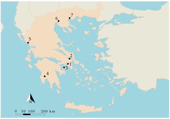 Location of the seven archaeological sites across Greece, where 1: Ancient Agora of Athens, 2: Amfiareion at Oropos, 3: Kolona on Aegina island, 4: Ancient Messene, 5: Nekromanteion of Acheron, 6: Ancient Forum of Thessaloniki and 7: Early Christian Amfipolis.