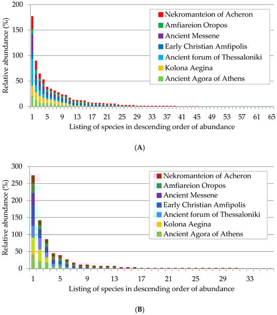 The Shannon–Wiener diversity index (H′) is sensitive to rare species, while the Simpson diversity index (D) depends on abundant species. As shown in the species abundance distribution diagram, higher values of the Shannon–Wiener index are observed in areas with many species of low abundance, such as Amfiareion at Oropos during the spring and Nekromanteion during the autumn, respectively. Similarly, areas with more abundant species exhibit high values of the Simpson index, such as Amfipolis and Amfiareion during the spring and Amfiareion during the autumn (Figure 3).