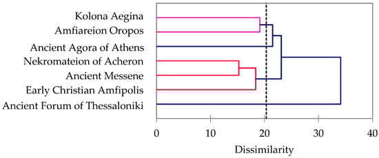 The dendrogram resulting from the cluster analysis of monuments based on the abundant plant species growing on their surfaces is presented in Figure 4. Four clusters were identified based on the analysis: the first cluster includes Kolona and Amfiareion, the second cluster comprises only of Ancient Agora of Athens, the third cluster consists of Ancient Messene, Amfipolis, and Nekromanteion, and the fourth cluster represents the Ancient Forum of Thessaloniki.