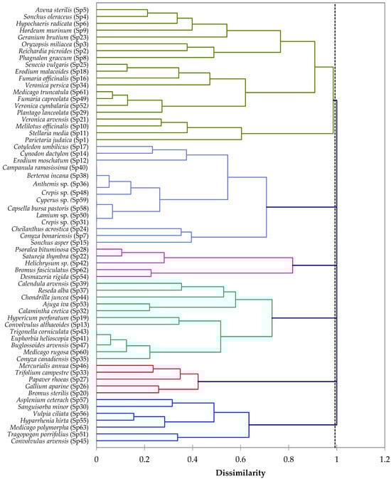 For each plant sample, botanical families were organized based on APG IV for angiosperms, and plant life forms were classified according to Raunkiaer []. The participation percentages of botanical families and the participation percentages of biological forms were calculated. These forms included therophytes, hemicryptophytes, geophytes, chamaephytes and phanerophytes. Additionally, the relative abundance: