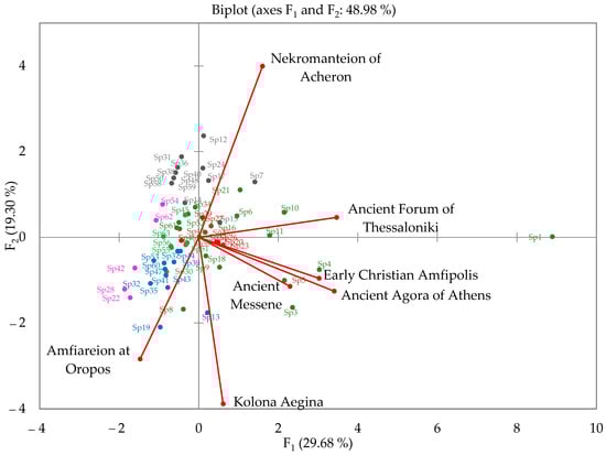 Regarding the plant species, neighboring data points predispose to potential clustering and are indicative of the areas that create the nearby axes of variation. An analogy can be observed with the groups derived from the cluster analysis. Species from the second group, which were abundant in Nekromanteion, cluster together and characterize Nekromanteion, forming the nearby axis of variation, such as Anthemis sp., Campanula ramasissima, and Cotyledon umbilicus (shown in grey in Figure 6). Species from the third and fifth groups, identified from the cluster analysis as dominant in Kolona and Amfiareion, align along the axis of variation created by Kolona and Amfiareion. These include Convolvulus althaeoides, Hypericum perforatum, and Calamintha cretica (shown in blue and pink in Figure 6). Species from the first group, which contained the most common species among the areas and included those abundant in multiple places, exhibit different component values (shown in dark green in Figure 6). Species with the highest component values are associated with the variation axis F1, formed by the Ancient Agora of Athens, Amfipolis, Messene, and the Ancient Forum of Thessaloniki. These species include Oryzopsis miliaceae, Sonchus oleraceus, and Avena sterilis. Species from the first group with lower component values are associated with the axis created by Nekromanteion, such as Veronica cymbalaria, Plantago lanceolata, and Fumaria officinalis. The species from the fourth group, abundant in the Ancient Agora of Athens and Amfipolis, also exhibit smaller component values along the variation axis created by these areas, including Bromus sterilis, Galium aparine, and Papaver rhoeas (shown in red in Figure 6). Lastly, species from the sixth group, which were abundant in Messene and Amfiareion, relate to the axis created by Amfiareion, including Hyparrhenia hirta, Asplenium ceterach, and Sanguisorba minor (shown in bright green in Figure 6).