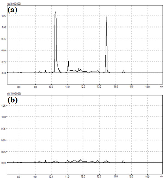A GC-ECD analytical method was developed and validated. The instrument parameters were optimized to detect, confirm, and quantify S-metolachlor and benfluralin residues in soil. With the set operating chromatographic conditions, S-metolachlor and benfluralin were separated and eluted. The approximate retention times of S-metolachlor and benfluralin were 13.438 and 10.236 min, respectively. The blank soil and herbicide chromatographs are shown in Figure 2.