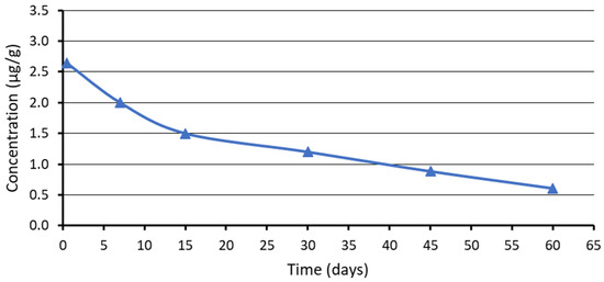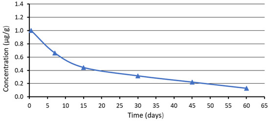 A field experiment was conducted at a farm to determine the persistence and behavior of S-metolachlor and benfluralin in soil. The initial deposits of S-metolachlor and benfluralin residues obtained from the 20 cm sampling depth zone were 1.003 and 2.64 μg/g at the recommended doses of 1350 and 1920 g a.i./ha, respectively. Both herbicides showed a faster dissipation rate during the initial seven days compared with that at 15 days. In particular, S-metolachlor and benfluralin showed 33.90% and 21.10% dissipation rates, respectively, from 0 to 7 days, while from 7 to 15 days the dissipation rates were 21.93% and 17.54%, respectively. From 15 days to 60 days, the dissipation rates of the herbicides did not exceed a percentage of 15%. The final S-metolachlor and benfluralin residue levels (60 days) in the soil in the first layer were 0.13 and 0.61 μg/g, which correspond to 87.04% and 76.89% of the initial concentration, respectively (Table 6 and Table 7). The dissipations of S-metolachlor and benfluralin were well-fitted in the first-order dissipation kinetics equation with high regression coefficients R2 of 0.946 and 0.963, respectively. The half-life (DT50) of benfluralin was higher (30.13 days) than the DT50 value for S-metolachlor in soil (21.66 days). The rate constant (k) for S-metolachlor dissipation was 0.032 d−1, and the rate constant for benfluralin dissipation was 0.023 d−1 (Figure 3 and Figure 4).