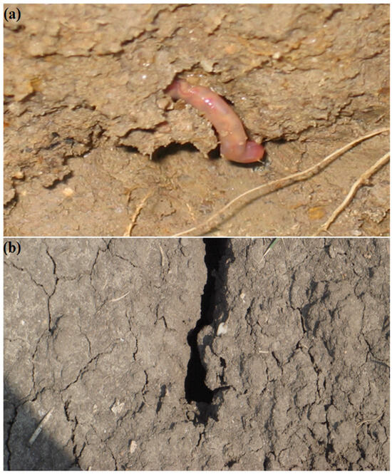 Preferential flow channels created by (a) roots and earthworms and (b) cracks (personal file).