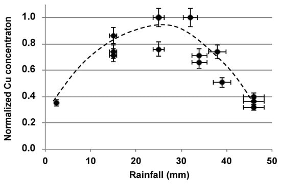 Figure 1 highlights the influence of rainfall on the copper concentration in the site drain water; the latter increased when rainfall increased up to around 30 mm, then decreased beyond that. A variation profile exhibiting these same trends was already observed when monitoring trace elements as a function of river water flow. This profile was attributed to the duality between the mobilization of elements from sediments and their dilution in the water flow [49]. In the present case, this profile can show that, above 20 mm, rainfall dilution and/or runoff can become predominant over the mobilization and transport of copper in infiltrated rainwater, or when mobilization and transport are less quantitative.