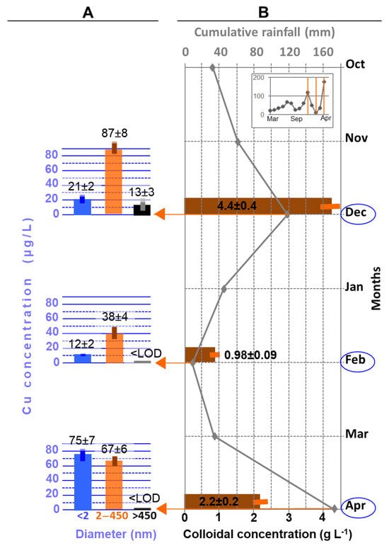 (A) Copper concentration over the dissolved-colloidal continuum of drain water collected in December, February, and April; (B) Monthly rainfall, superimposed with the colloidal concentration in drain water (in bold characters). LOD: 0.6 µg(Cu) L−1, 450 nm mentioned to define the fractions in the histograms (A) corresponds to the nominal sizes (cut-off threshold) of the filters used.