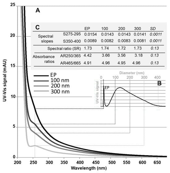Typical UV-Vis spectra (A) of soil leachate measured for different sizes of the colloidal continuum (shown at 254 nm in (B)): Early peak (EP) and 100, 200 and 300 nm gyration diameters (A), and their associated spectral characteristics (C). EP corresponds to the peak eluted very quickly at the start of the fractionation (AF4), with a diameter of 15–20 nm at the peak top. For more details see the text regarding Figure 4 and Table 1.
