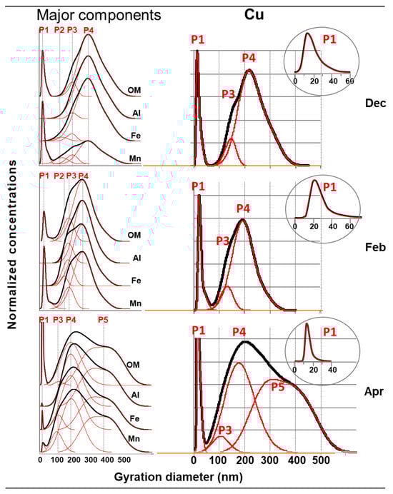 Size distribution of major components and copper in the colloidal phase of the filtered drain waters, with the different populations identified according to their main composition (P1 to P5). OM from the UV-Vis detector, and Al, Fe, Mn, and Cu from ICP-MS.