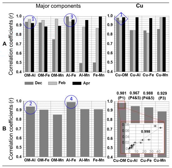 Correlations between (A) the signals for each of the samples and (B) the concentrations in all the populations of all the samples, for the major components and copper whose distributions were presented in Figure 4. In addition, the concentration of Cu is plotted as a function of the concentrations of OM on the dissolved-colloidal continuum (concentrations expressed in mg L−1) (red box at the bottom right). All these coefficients were found statistically significant. For the details, see the text.