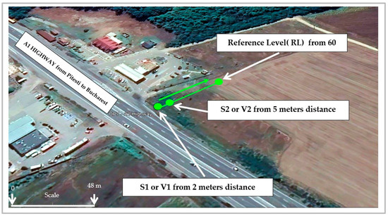 In total, 9 observation points (OP) were established on the section of the A1 Bucharest–Pitesti highway in Romania in order to evaluate the soil and vegetation quality. The points for taking soil samples were marked with S, and those for vegetation were marked with V. In choosing the areas, we took into account the assurance of representativeness, and chose key areas, such as the entry and exit points on the highway where road traffic is intense, and areas provided for parking, where there are service spaces in the category of fuel distribution stations. Also, specially designed areas where the highway is crossed by other roads, industrial, or commercial areas in the proximity of the highway, and areas without any development (free zones) were taken into account.
