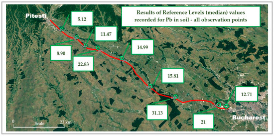 In order to evaluate the pollution of the soil and vegetation with toxic metals in the areas adjacent to the A1 highway, a series of specific evaluation indices were used. In addition to these indices, the results obtained were reported to the reference values for traces of chemical elements in the soil from Romanian Order 756/1997 (approval of the regulation regarding the assessment of environmental pollution) for sensitive land use types (Table 2) [34].