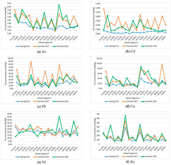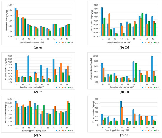 By monitoring the soil over time at the sampling points 2 m and 60 m (RL) from the road embankment (Figure 8), it can be seen that the lowest concentrations were obtained in the sampling campaign of spring 2017 in most of the analyzed samples. This indicates that in the spring, the concentrations of toxic metals on the soil surface were lower due to the soil surface being washed with water from the snow accumulated during the winter. The toxic metal concentrations varied in the other two sampling campaigns (summer 2017 and 2022). In the summer 2022 campaign, a decrease in the Cd and Pb concentrations and a slight increase in the As, Cu, and Zn concentrations were observed. This increase could be associated with the increase in cars transiting the highway. Figure 9 shows the concentrations of toxic metals obtained in the soil samples taken at a distance of 2 m, 5 m, and 60 m from the road embankment.