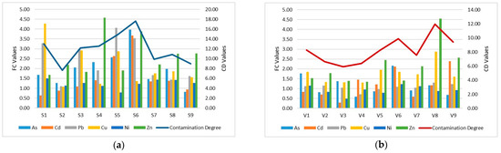 Referring to the contamination factor (Figure 10a), it can be seen that for most of the analyzed toxic metals, the contamination was moderate (1 ≤ CF ≤ 3). At sampling points S4 and S6, there was considerable contamination with zinc (3 ≤ CF ≤ 6). The degree of contamination was in the interval of 7.67–17.65, which indicates a moderate degree of contamination at S2, S3, S7, S8 and, S9, and a considerable degree of contamination at the other studied points (Table 3). In most vegetation samples (Figure 10b), contamination with toxic metals was low for Cd and Ni and moderate for the other analyzed toxic metals, with zinc being the only one that induced considerable contamination at sampling point V8. The degree of contamination of the vegetation samples was moderate for all investigated points (Table 3).