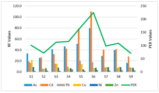 The ecological risk factor indicates a moderate ecological risk at sampling points S3, S4, S5, and S6 (for arsenic) and at points S4, S5, S7, and S8 (for Cd), and a high ecological risk at point S6 (for Cd). The RF was low for all other analyzed toxic metals (Figure 11). The potential ecological risk was moderate for points S5 and S6. For all other investigated points, the PER was low (Table 3).