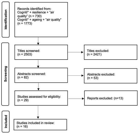 Combining ref. [1] and the PRISMA-ScR checklist [2], a scoping review of SCOPUS using ‘cogniti*’ + ‘resilience’ + ‘air quality’ or ‘cogniti*’ + ‘ageing’ + ‘air quality’ resulted in n = 2503 articles, screened and reduced using inclusion and exclusion criteria, for a total of n = 16 articles.