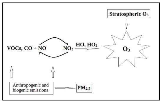 As can be seen in Figure 1, there is an entire process in ozone (O3) formation that involves photochemical reactions between VOCs and oxides of nitrogen (NO and NO2), but also PM2.5 (particulate matter with a diameter of 2.5 μm) which reacts with free radicals (e.g., HO2), forming ozone [5]. Ground-level ozone, a highly reactive gas, is prevalent in urban and suburban environments. A study conducted from 2015 to 2017, encompassing 258 million people across 70 cities in China, revealed a correlation between ozone air pollution and an upswing in hospitalizations for heart disease [6]. The findings indicated that each increment of 10 µg of ozone per m3 of air was associated with a 0.75% rise in heart attack hospitalizations and a 0.4% increase in strokes. While these percentages may seem modest, the impact becomes “magnified to more than 20 times” when ozone levels exceed 200 µg during the summer. The study suggests that exposure to ozone could be linked to 15% of heart attacks and 8% of strokes [6].