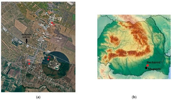 Air quality monitoring in Magurele. (a) The 3 locations P1, P2, and P3 in Magurele for ozone monitoring; (b) the position of Magurele city on the Romania map.