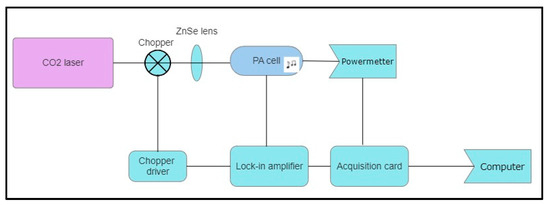 where V (V)—photoacoustic signal; α (cm−1 atm−1)—absorption coefficient; C (Pa cm W−1)—cell constant; SM (VPa−1)—microphone sensitivity; PL (W)—laser; and c (atm)—gas concentration.
