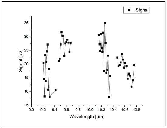 The range of wavelengths in which the CO2 laser emitted in the LPAS system was 9.2–10.8 µm, grouped in the 9R, 9P, 10R, and 10P branches, covering 54 different vibrational–rotational lines with a maximum power of 6.5 W. In this range, ozone molecules, in particular, demonstrate significant absorption on the 9P(14) laser line at a wavelength (λ) of 9.5 µm, with an absorption coefficient (α) of 12.7 cm−1atm−1 [19].