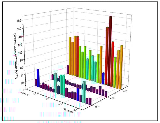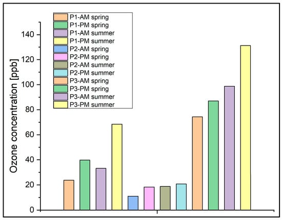 As was mentioned above, the ozone level limit recommended by the EU is 61 ppb, and that indicated by the WHO is 51 ppb. Thus, in location P3, the ozone concentrations far exceeded the limits imposed by the WHO and the EU, especially in the summer season.