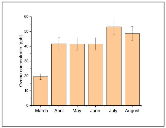 In the campaign to assess atmospheric ozone concentrations utilizing a laser spectroscopy-based system, the measurements revealed levels on the order of ppb. During this timeframe, the lowest ozone concentration was identified at the P2 location, corresponding to 7 ppb. Conversely, the peak of ozone level was recorded at the P3 location, reaching 185.5 ppb. Thus, during the entire period of measurement, the average value of ozone concentration was 24.45 ± 16.44 ppb in point P1, 11.96 ± 3.80 ppb in P2, and 95.01 ± 37.11 ppb in point P3. The mean ozone concentration values from March to August in the three measuring points are presented in Figure 5.