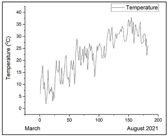 The variation of the maximum daily temperature in the period March–August 2021.