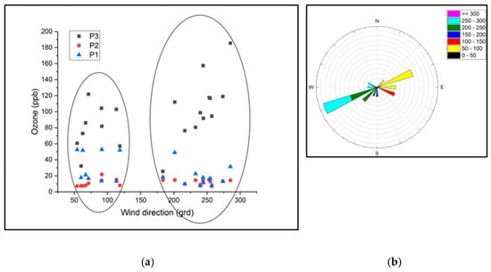 (a) The distribution of the ozone concentrations in the three measurement locations according to the wind direction; (b) representation of the wind direction in the March–August 2021 period.