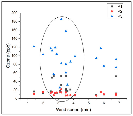 Observing Figure 10 reveals a correlation between ozone concentrations and wind direction, specifically, correlations with wind from the east (E) and northeast (NE) within the range of 54 to 91.5 degrees, as well as from the south (S) and southwest (SV) within the range of 180 to 273.9 degrees. Figure 11 shows the distribution of the ozone concentrations in the P1, P2, and P3 points as a function of wind speed. In this figure, it can be seen that it seems that part of the ozone concentrations were distributed in the range of 2.5–4 m/s.