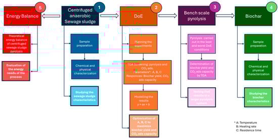 This study explored the potential of using the biochar produced by the pyrolysis of sewage sludge as a valuable material for the adsorption of CO2. More in detail, this work adopts a DoE approach to develop an understanding of the effects of pyrolysis design factors, namely, pyrolysis temperature, heating rate and residence time on biochar yield and CO2 adsorption capacity. Furthermore, two sets of representative experiments from DoE were repeated in a different and more realistic pyrolysis system and the produced biochars underwent a chemical-physical characterization. Lastly, a theoretical energy balance was calculated for the drying and pyrolysis phases of a centrifuged sewage sludge outgoing a wastewater treatment plant. Figure 1 shows the scheme of the phases of this study.