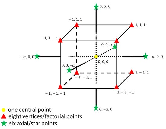 where f is the number of parameters studied. These experiments were carried out by varying the parameters within a symmetric domain, consisting of a cubic space, (Figure 2) where the vertices of the domain (factorial points) are represented by coordinates +1 and −1, the axial points (sometimes called “star” points) are represented by the coordinates 0, α, α and the central point by coordinates 0, 0, 0.