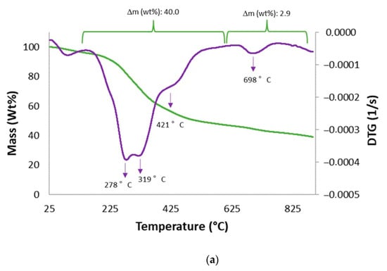 Figure 3a shows the thermal behavior of the sample through TG and derivative TG (DTG) curves, highlighting the temperatures and mass variations during the thermal degradation under an inert atmosphere. Except for the first mass loss (below 170 °C) due to water evaporation, the pyrolysis of the sample occurred in four steps. The first three, in the range 170–590 °C with a mass variation of about 40 wt%, correspond to the main decomposition phase in sewage sludge, involving the emission of organic volatile substances [33]. The DTG curve in this temperature range shows two overlapping peaks with maxima around 280 °C and 320 °C, along with a shoulder near 420 °C, attributed to the decomposition of carbohydrates and proteins and aliphatic compounds, respectively. The fourth isolated step occurring at around 700 °C with a slight mass loss of 3 wt%, is mainly attributed to the decomposition of inorganic materials, such as calcium carbonate [33]. At the end of the analysis, the TGA curve was characterized by weight loss with an approximately constant rate, not reaching a plateau. The final residue (39 wt%) appeared as ash covered by a layer of coke.