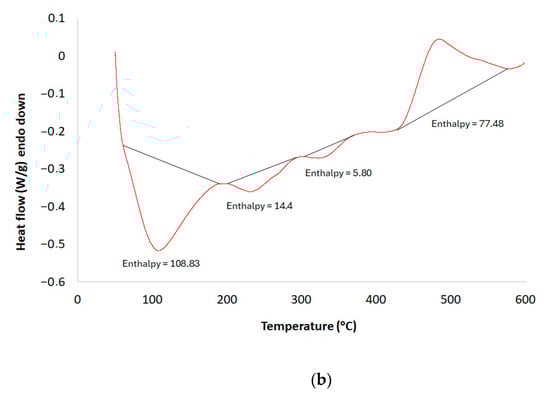 As shown in Figure 3b, the DSC curve exhibits four main transformations. The extremely large endothermic peak before 200 °C was attributed to the latent heat of water vaporization resulting from the moisture content and the decomposition of the bonded hydrated compounds in the sample. The subsequent endothermic peaks, occurring between approximately 200 and 380 °C, corresponded to the major peaks in the DTG curve, indicating that these reactions were accompanied by intensive mass loss.