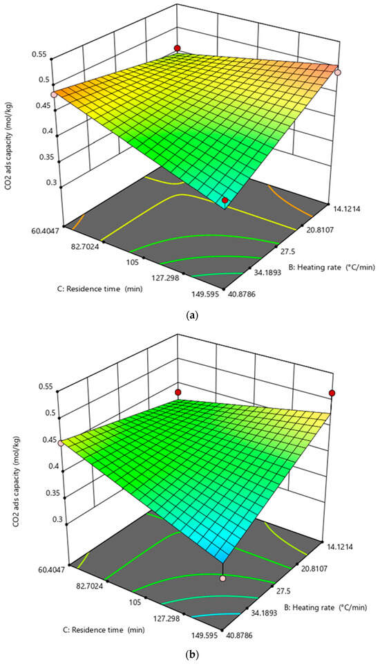 Figure 4 shows the trend of CO2 adsorption capacity as a function of the biochar synthesis parameters: heating rate and residence time at two different temperatures (490.5 and 609.5 °C). Comparing Figure 3a,b, it can be noted that the shape of the two 3D curves is very similar, they are quite simply translated and, consequently, heating rate and residence time did not change their way to influence the CO2 adsorption capacity as the temperature changed. Generally speaking, in the investigated temperature range, the CO2 adsorption capacity increased (from 450 to 500 °C) and then decreased (from 500 to 650 °C) with increasing temperature, although the best result was found at 609.5 °C (14.12 °C/min and 49.6 min, run 16). Lu and collaborators [42] found that the surface area of biochar increased with temperature, but it was reduced for biochars obtained at 550–650 °C, possibly owing to the pore enlargement phenomenon because of a loss of volatiles in the intermediate thermoplastic phase. The formation of a macro-porous structure decreases the specific surface area, and consequently, the CO2 adsorption capacity. These effects can be explained considering that higher temperatures favored the volatilization of solid matter with the consequent lower formation of biochar per unit mass of solid residue. Furthermore, higher CO2 adsorption capacity was obtained for slow heating rates at long residence times and for short residence times at high heating rates. Also, the influence of heating rate and residence time on the CO2 adsorption capacity was related to the release of volatile matter during pyrolysis. As an example, a slow heating rate and long residence time gave the time for the development of a porous structure during the thermal degradation of sewage sludge. On the contrary, long residence time with a fast heating rate caused an excessive production of volatile matter with the consequent formation of a macro-porous structure.