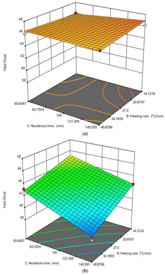 Figure 5 shows the trends in biochar yield as a function of the heating rate (B) and residence time (C) at 490.5 and 609.5 °C, as an example. Biochar yield achieves its optimum between 300 and 500 °C and, once the temperature of complete carbonization is reached, biochar yield is reported to constantly decrease with temperature [40,44].