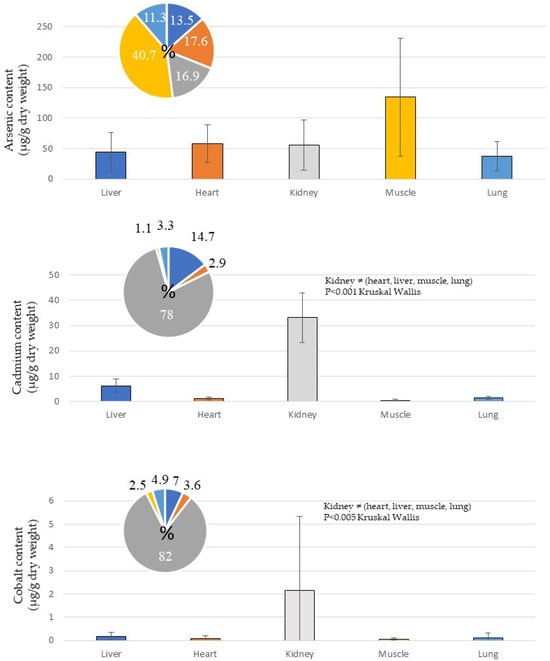 | Heart (13) | 20.71 ± 4.72 | 11.93 ± 2.19 | 782.65 ± 357.43 | 1.63 ± 0.84 | 169.20 ± 42.11 | 58.10 ± 31.27 | 0.03 ± 0.03 | 1.23 ± 0.59 | 0.09 ± 0.11 | 1.37 ± 1.43 | 0.77 ± 0.69 | 0.29 ± 0.34 |