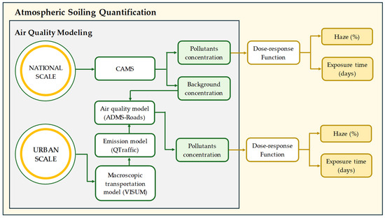 The methodology adopted for assessing atmospheric soiling is based on modelling and mapping the pollutants concentrations and soiling at multi-scale following the main recommendations of the International Co-operative Programme on Effects on Materials (ICP Materials) [24]. The methodological framework implemented in this study includes four steps: (i) estimation of pollutant concentrations; (ii) quantification of atmospheric soiling; (iii) spatial distribution at national and urban scales; and (iv) a comparison between the results (Figure 1).