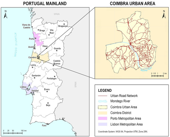Coimbra urban area (Figure 2) is a part of Municipality and Region with the same name, located in the centre of mainland Portugal. The Municipality of Coimbra had a resident population around 141,000 inhabitants in 2021 and average population density of around about 440 inhab/km2 [27]. Coimbra is distinguished by its historical and architectural heritage; its central area is classified as a UNESCO World Heritage site. It is also home to one of the oldest universities in Europe, the University of Coimbra, known as a university city, although about 25% of the resident population is elderly. Local air pollution in Coimbra is mainly related with road traffic emissions, commercial activities, and residential biomass burning [14,15,31,32,33,34,35,36].