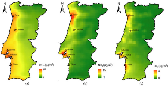 NO2 concentrations (Figure 3b) exhibit a strong correlation with road traffic emissions, showcasing higher pollution levels in urban areas, with greater prevalence in the most populous municipalities in Portugal, namely Lisbon, Porto/Vila Nova de Gaia, and Setubal Peninsula. Conversely, SO2 concentration (Figure 3c) peaks are in industrial zones, reflecting their association with industrial activities. With emphasis on the location where the Sines refinery is installed in the south of the Setubal district, where the highest values are observed. The spatial variation of annual mean PM10 concentrations (Figure 3a) presents a smoother pattern influenced by diverse pollution sources and the long-range transport of mineral dust. Overall, densely populated coastal zones emerge as the most significantly affected areas for all pollutants.