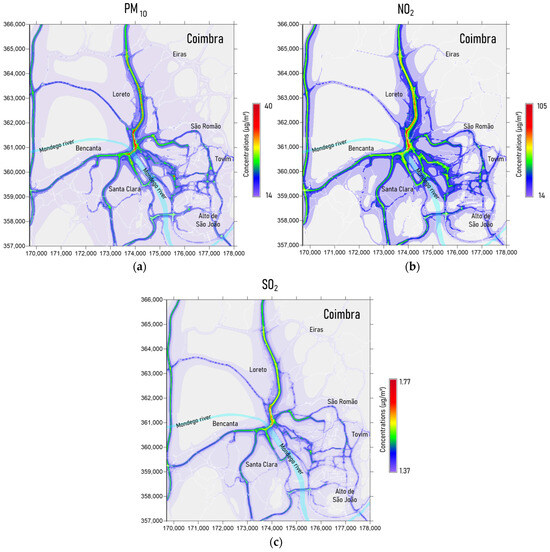 Spatial distribution of annual mean concentrations for PM10 (a), NO2 (b), and SO2 (c) in 2018 for Coimbra city.