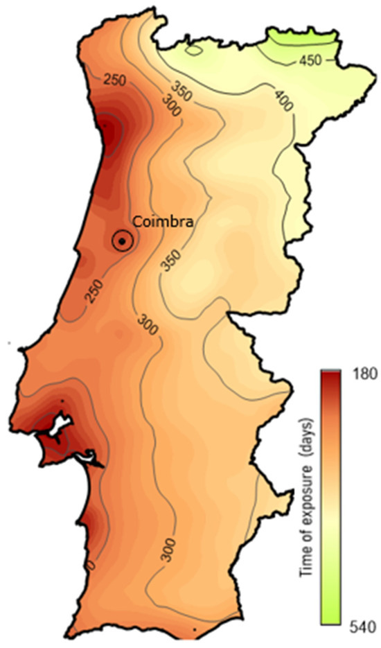 The spatial variability of glass soiling for mainland Portugal is analyzed in terms of the number of days required to reach a 1% haze, utilizing a multipollutant dose–response function for the soiling of transparent material, as previously described (Equation (2)). The resulting soiling map (Figure 5) unveils significant variations in the exposure time needed to attain a 1% haze and illustrates its spatial distribution across Portugal.