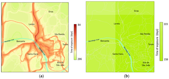 Soiling effect for modern glass in Coimbra—days to reach a haze of 1%. Results from urban scale modelling (a) and results from national scale modelling (b).