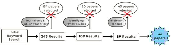 Figure 1 shows the filtering phase of the review methodology. This keyword combination resulted in 243 research papers. After that, it was reduced to 109 by limiting the results only to journal papers and limiting the time frame from 2019 to 2023. The red crosses in Figure 1 indicate the rejection of that set of papers. Next, the literature review papers were identified by reading the topic of every resulting research paper. There were 20 literature review papers that were later rejected. Then, by reading the abstracts of the remaining papers, 43 papers were identified as irrelevant to this study because they were not focused on the LCA of the AD of OW. Some of those studies had considered different approaches such as machine learning-based approaches to evaluate the environmental and economic impacts of the solid waste management strategies but did not use the LCA tool. Some papers discussed the LCA studies conducted on OW management using other technologies such as hydrothermal carbonization and incineration but not AD. In the end, 46 journal papers were selected for this review study.