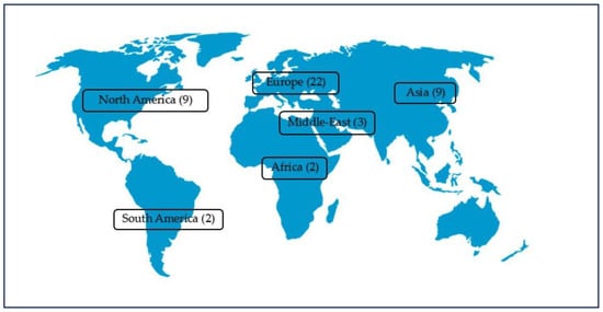 The published literature reveals that most of the previous research efforts (67%) focused on the environmental performance of AD while the remainder (33%) considered both life cycle environmental and economic performance. Tominac et al. identified a similar pattern highlighting the lack of comprehensive studies that focused on the triple bottom line of sustainability [22]. Furthermore, it is important to examine the geographic distribution of the research contributions to this research area. Figure 2 illustrates how the reviewed studies are distributed by geographic region. The origin of the research study was decided either by examining the considered case study location or the used country-specific data sources for the LCA. or the referenced country-specific data sources.