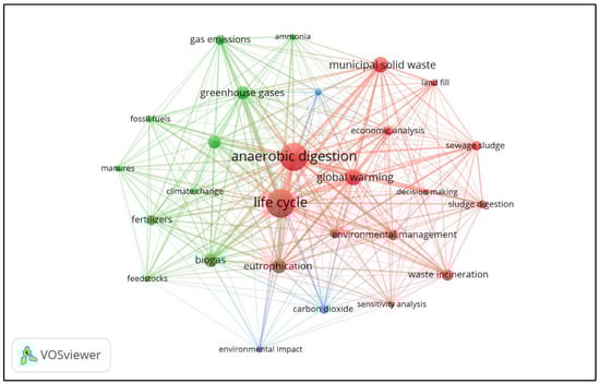 The keywords in the title and the abstract of the reviewed 46 research papers from the Engineering Village database were evaluated using the VOS viewer software. The software identified 27 keywords in the title and abstract of the 46 research papers. The connection lines are drawn considering the co-occurrence of those keywords as shown in the network visualization map in Figure 3. The concept of co-occurrence is the appearance of two terms in one paper together. The keywords identified via the software as exhibiting the highest occurrence were life cycle (48), anaerobic digestion (47), global warming (20), eutrophication (17), and municipal solid waste (19). The size of the circles and the labels in that map reflect the frequency of appearance of that keyword in the research papers. The distance between the keywords reflects the appearance of those words together in the reviewed papers. According to Figure 3, “anaerobic digestion”, “life cycle”, and “global warming” can be verified as the highest co-occurring keywords because of their large circles and location close to each other.