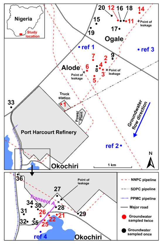 Using pipelines to transfer oil and gas has become a widespread global practice because they are considered the safest and most economical, particularly when transporting over long distances [1,2]. The Nigerian National Petroleum Corporation (NNPC) maintains a pipeline network of over 5000 km. Since the pipelines are constructed of carbon steel, leakage due to corrosion is a common problem; for example, see [3]. Additionally, problems of pipeline leakages resulting from oil theft/sabotage and vandalism (commonly called bunkering), aging infrastructure, equipment failures, and operational failures have been frequently observed in oil and gas infrastructures worldwide [1,4,5,6,7]. For instance, in Nigeria, Shell Nigeria reported 11,000 barrels per day of crude oil loss in their pipeline networks in 2018 due to leakages, an increment of about 550% compared to the previous year’s data [2]. Such leaks are the main cause of oil losses and can lead to extreme environmental pollution, degradation, and economic losses [6,7,8,9]. Several studies have investigated the occurrence of pipeline leakages into groundwater (e.g., [10,11,12,13,14,15,16,17]), in the submarine environment (e.g., [18,19,20]), and in soils (e.g., [21]) at several locations worldwide. Also, investigations were reported for leakages in soils and groundwater near petroleum facilities and petroleum product spills (e.g., [22,23,24,25,26]), petrol stations, and other gasoline-containing storage facilities (e.g., [27,28,29,30,31,32]). As underground petroleum pipelines leak, the frequently co-occurring monocyclic aromatic compounds, i.e., benzene, toluene, ethylbenzene, and the three forms of xylenes (o, m, p), commonly referred to as BTEX, might be released into groundwater along with other hydrocarbon constituents, including several polycyclic aromatic hydrocarbons and organochlorine compounds [30,33,34,35]. These compounds, especially BTEX, can readily migrate through the soil [36] and contaminate groundwater due to their highly soluble nature. The aqueous solubilities of benzene, toluene, ethylbenzene, and xylenes are 1780 mg/L, 515 mg/L, 161 mg/L, and 204 mg/L, respectively [37,38,39]. To our knowledge, despite the substantial use of underground pipelines for crude oil transfer in the Niger Delta region [40], investigations on groundwater contamination from pipeline-related leakages are unavailable.