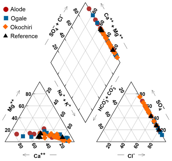 Based on the major ions, the hydrochemical facies of the groundwater were evaluated through the trilinear Piper diagram [98]. Two water types were identified: sodium–chloride (Na-Cl, 74%) and calcium–chloride (Ca-Cl, 26%) (Figure 2). In Alode, the facies were 62% Na-Cl and 38% Ca-Cl type. In Ogale, the facies were 75% Na-Cl and 25% Ca-Cl type; whereas, in Okochiri, closest to the coast, the facies were 83% Na-Cl and 17% Ca-Cl type. Despite the Na-Cl type’s dominance, there was no incidence of saltwater intrusion in the groundwater (salinity: 0.01 to 0.17 PSU). Anthropogenic influence, rather than mixing freshwater with saltwater, was likely responsible for the Na-Cl water type in this study.