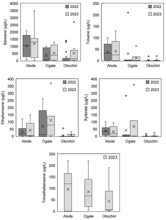 Although benzene, toluene, ethylbenzene, trimethylbenzene, and xylenes were released into the subsurface simultaneously, their concentrations vary significantly in the groundwater. The benzene concentration dominates in the wells, with a Pearson correlation coefficient of r = 0.97 in 2022 and 2023. Figure 3 and Figure 4 show the percentage comparison between concentrations of benzene, toluene, ethylbenzene, xylenes, and trimethylbenzene in Alode, Ogale, and Okochiri, demonstrating the dominance of benzene in the study groundwaters. Overall, the order of abundance was benzene > trimethylbenzene > ethylbenzene > xylenes > toluene. In 2022, benzene constituted 91% in Alode, 72% in Ogale, and 97% in Okochiri. In 2023, those values were 85% in Alode, 66 % in Ogale, and 90% in Okochiri.